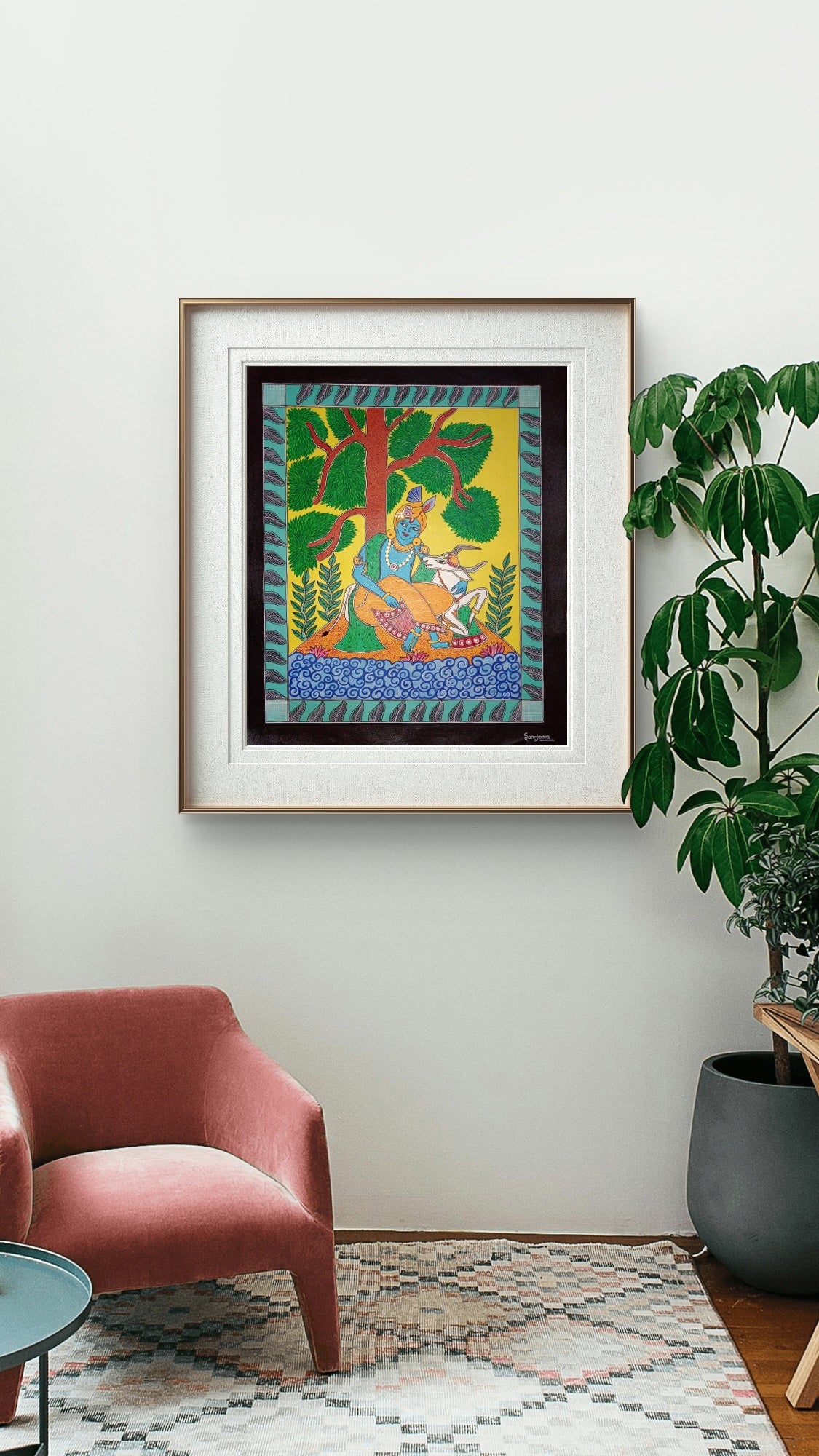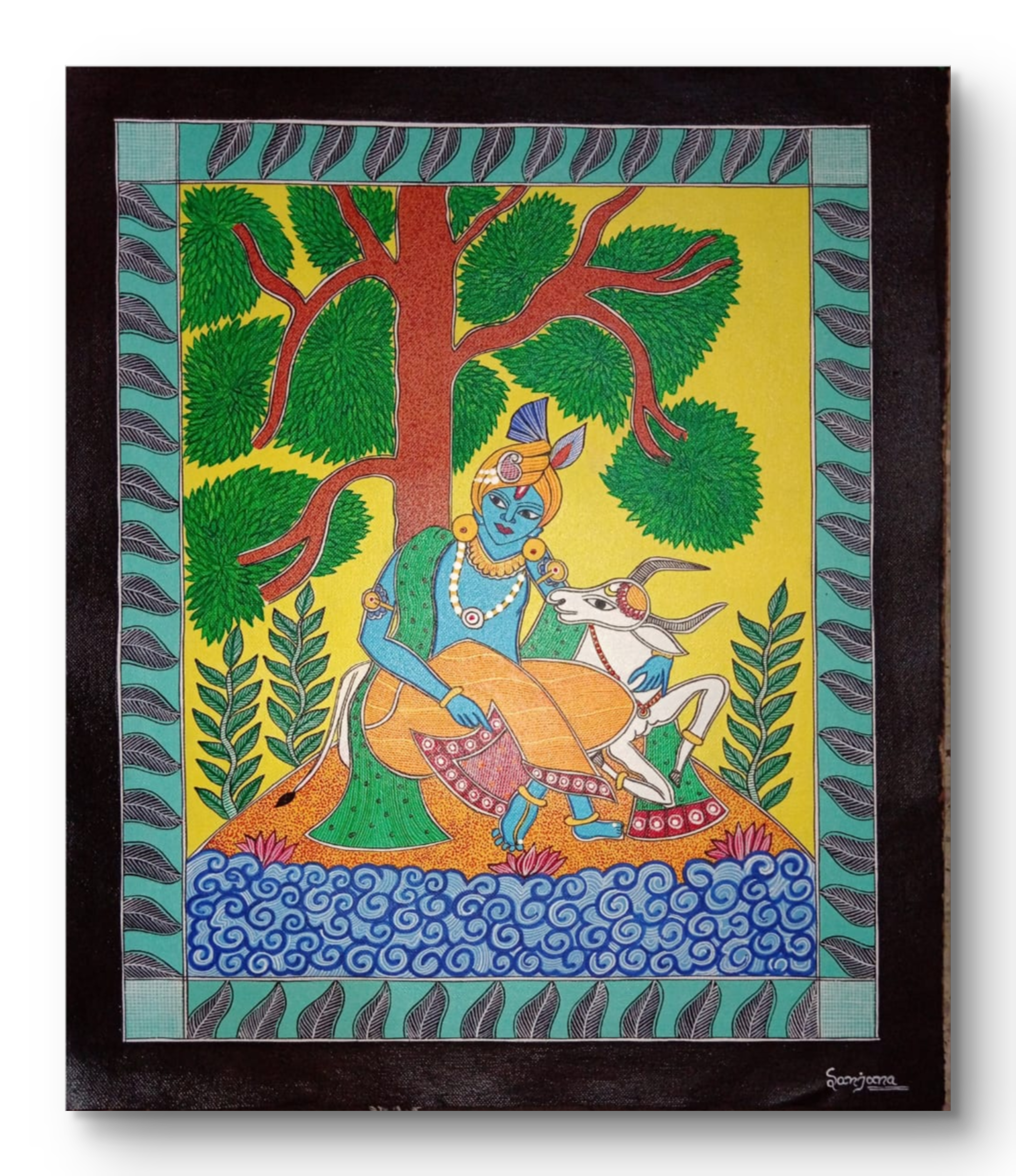 Lord Krishna With His Cow By The River In Mithilla Art -Acrylic (46" * 60")By Artist Sanjana Banka